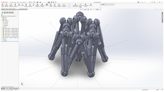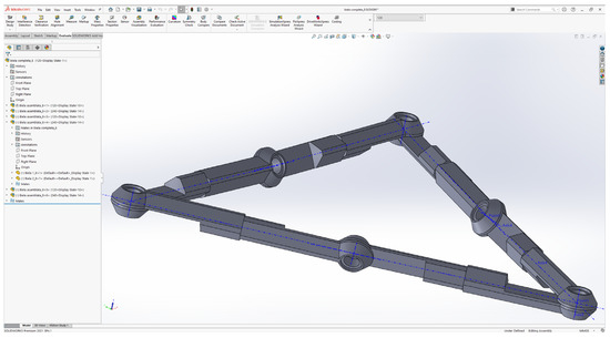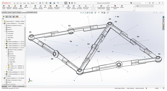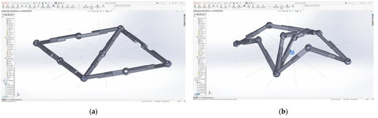 In order to achieve the parallel translational 6R mechanism, it was necessary to have a multi-stage design and an optimization of the mechanism so that it could be collected as much as possible. In this respect, the connection between the joints in Figure 4, hereinafter referred to as connecting rods, has been divided into 2 components, rods, which allow the positioning of the ends of the connecting rod joints at different angles, 30, 60, 90, 120, etc. The design was carried out assisted by the Solidworks platform with the Solidworks Motion Analysis add-ins [22].