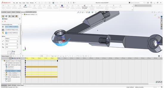For the purpose of the tightening movement of the mechanism, the Motion Analysis add-ins from Solidworks were used. In this regard, for the movement of the mechanism, two linear motors were introduced on points O1 and O2, at the same time in the direction of the Oy axis, as shown in Figure 12.