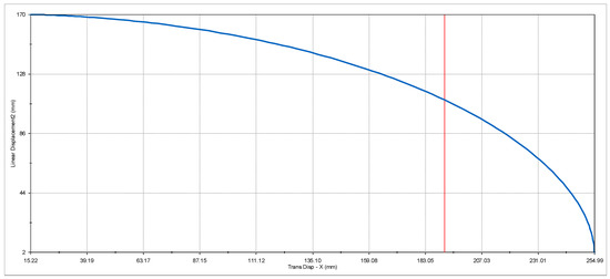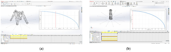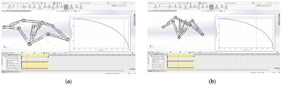 The movement is performed over a distance of 300 mm, a distance that does not allow a complete tightening, because from the virtual motion tests, we found that an ideal simulation, which perfectly tightens the mechanism, leads to errors in the integration type model area. Thus, following several successive tests, it has been established that the ideal distance for which the linear motor is active is 300 mm. The simulation duration was set to 5 s and results and movement can be seen in the Figure 13 and Figure 14.