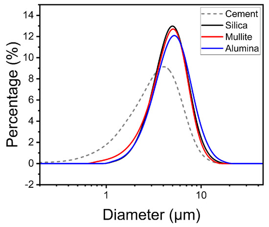 Silica (99% fused silica, DIGHEN Composite Material Technology Co., Ltd., Lianyungang, China), mullite (fused mullite (64.2 wt% Al2O3 and 36.8 wt% SiO2), DIGHEN Composite Material Technology Co., Ltd., Lianyungang, China), and alumina (fused alumina, DIGHEN Composite Material Technology Co., Ltd., Lianyungang, China) powders, which had an average particle size of 4 µm (Figure 1), were prepared as the raw sand materials for refractory purposes. The cement used as a binder for preparing the mold was made of CAC (HF80N, UNION Corp., Seoul, Korea) with quick-setting performance powder for fire resistance. The CAC had an average particle size of <4 µm (Figure 1). A water-based activator with 2% 2-pyrrolidone was used for preparing molded bodies and in powder bed tests. It was dried in a 100 °C oven for 24 h to ensure that it could sufficiently mix with the sand to prevent lumping; however, since it contained atmospheric moisture, it was lumpy and not easily mixable. Since the densities of sands were different, as shown in Table 1, the cement was mixed with each sand in a definite volume ratio. The prepared samples were mixed with 1 mm zirconia medium by horizontal ball milling for 2 h. The cube-shaped mold samples prepared from the mixtures of silica and CAC, mullite and CAC, and alumina and CAC were named S + C, M + C, and A + C, respectively.