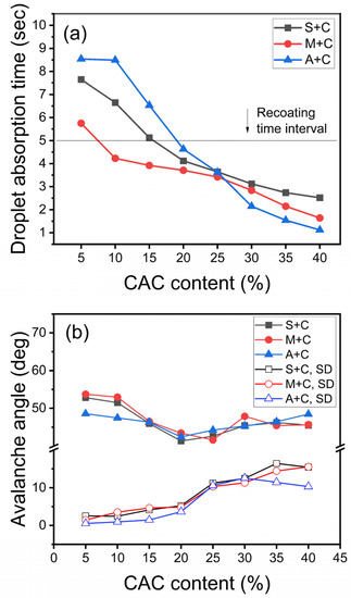 (a) Droplet absorption time and (b) avalanche angle by calcium aluminate cement (CAC) content.