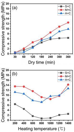 As can be seen in Figure 4b, all samples are hydrated even after 6 h of air drying and show slightly higher strengths. All samples show a sharp decrease in strength at 400 °C. Up to their lowest strengths, the S + C, M + C, and A + C samples show a reduction in strength of 88.9% (6.43 MPa to 0.71 MPa), 37.7% (14.49 MPa to 8.31 MPa), and 35.6% (12.23 MPa to 7.23 MPa), respectively. This affects the characteristics of CAC owing to the different sand types; CAC cement showed the same trend as a result of strength reduction in the temperature range 600–1200 °C [16,22,23,24]. In comparison, the strength of silica significantly decreased at 600 °C, and the strength recovery was slow at higher heating temperatures [22]. On the other hand, alumina rapidly recovered its strength after the lowest strength at 800 °C, whereas mullite showed a decrease in strength after the recovery at 1000 °C. This is a result of the change in pores due to sintering [25,26,27].