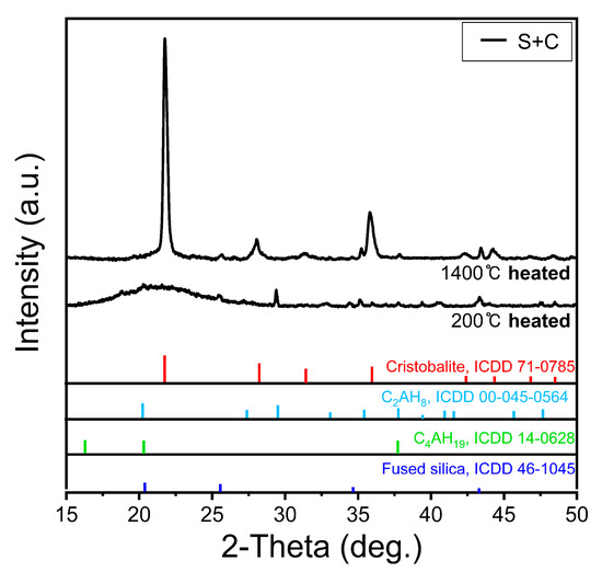 Figure 6 shows the XRD pattern of the S + C sample. The C2AH8 and C4AH19 phases, which are hydrated by the CAC observed at 200 °C, confirm that the peaks weaken owing to dehydration at 1400 °C. The existing amorphous silica crystallizes at 1400 °C, which promotes the cristobalite phase formation [34,35]. Cristobalite reduces the hardening strength of the mold, thereby affecting the low sintering strength shown in Figure 4b.