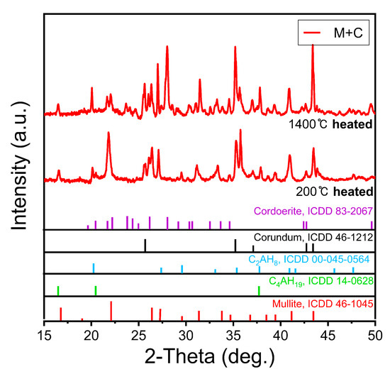 Figure 7 shows the XRD pattern of the M + C sample. The molded body dried at 200 °C is sufficiently hydrated and shows no CA, CA2, and CA6 component peaks, which are the CAC phases. The C2AH8 and C2AH19 peaks that appear after the initial hydration disappear or weaken at 1400 °C. The mullite phases, shown at 200 °C, transform to corundum and cordoerite phases when heated to 1400 °C. Then, the formation of corundum appears to affect the reduction in strength of the molded body [26]. However, at 1400 °C, the cordoerite phases are identified more prominently, thus confirming an increase in strength due to the sintering of mullite up to 1400 °C [27].