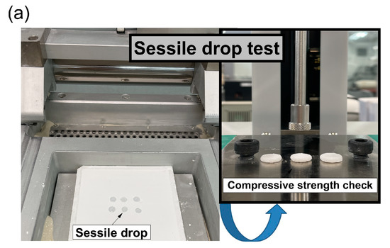 Powder bed sessile drop test: (a) Proceed with sessile drop test using sessile drop tester, (b) spread diameter as a result of sessile drop test, (c) compressive strength as a result of sessile drop test.