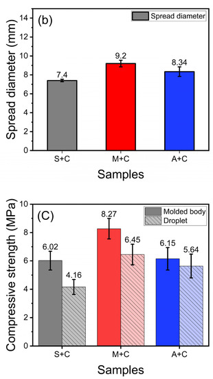 Every mixed powder sample for 3D printing was investigated by preparing a powder bed using a sessile drop tester (Figure 9a). Figure 9b shows the absorption area of the droplets formed at the powder interface in terms of the spread diameter. In addition, every absorbed region was separated from the powder bed after 4 h to measure the compressive strength. The average spread diameters of the S + C, M + C, and A + C samples are 7.4 mm (narrowest), 9.2 mm, and 8.3 mm, respectively. An inference from the spread diameters of the droplet is that the surface resolution of the molded body is adversely affected when the mold shows high spread diameters [17]. Therefore, the surface quality of the S + C sample is expected to be better. In Figure 9c, the strength values show the same trend as the strength results measured on the molded body, i.e., a lower strength despite the same 4 h curing time. It is only that the formation of forming strength after the hydration process by water drop is lower than the water reactivity by slurrying [5].