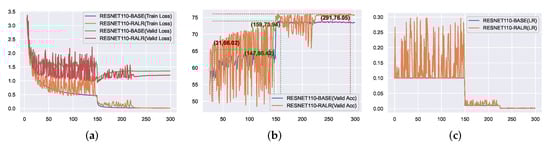 Training and validation loss, validation accuracy, and changing of learning rate while training the CIFAR-100 dataset using network ResNet-110. (b) The orange curve shows the validation accuracy of the new learning rate policy. (a) Loss. (b) Validation accuracy. (c) Learning rate.