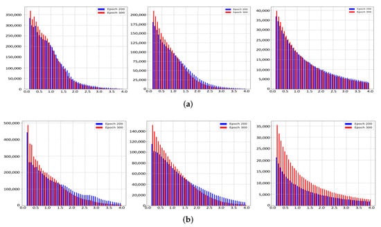The global learning rate is a hyper-parameter that controls how much to change the model. Traditionally, the global learning rate decreases at specific epochs, i.e., the learning rate may become smaller and smaller, and the learning rate might be too small after some epochs, resulting in the optimizer sticking in saddle points or local minima that may slow down the training speed and restrict the network performance in a long time []. The x-axis on each subfigure of Figure 2 indicates the value of the activation units, and the y-axis indicates the number of activation units under this specific value. As shown in Figure 2a, the activation values of test images or the network parameters are substantially unchanged for the last 100 epochs, which indicates, the network cannot update effectively in the remaining training time. Increasing the learning rate between reasonable boundary values at the specific probability can potentially help the training escape saddle points and local minima and find flatter minima with good generalization performance by the leap forward of the network’s weights updates. Figure 2b shows that the network’s activation values and weight parameters are updated effectively with the RALR for the last 100 epochs. That means the network may restructure the parameter weight vector to gain near-optimal performance. Each column of Figure 2 indicates the activation values of different convolutional layers for one given image. The first, second, and last column indicate the activation values of the layer1, layer2, and layer3 of ResNet-110.