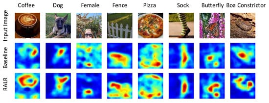 From Equation (1), we have known that the learning rate is a crucial hyper-parameter for SGD. To characterize the surprising phenomenon of RALR, we use the class activation mapping (CAM) [] to visualize the activation units of network ResNet-110 trained on the Tiny-ImageNet dataset (http://tiny-imagenet.herokuapp.com/, accessed on 25 December 2021), and a class activation map for a particular category indicates the discriminative image regions used by the convolutional neural network (CNN) to identify that category. Figure 3 shows the comparison of class activation mapping, where objects of RALR are more precise and more accurate than the original ones.