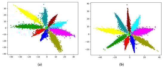 The feature embedding of ResNet-110 on the CIFAR-10 dataset. The network is trained with the cross-entropy loss and updated by SGD. Each color on the picture represents a category of the CIFAR-10 dataset. (a) Baseline. (b) Random learning rates.