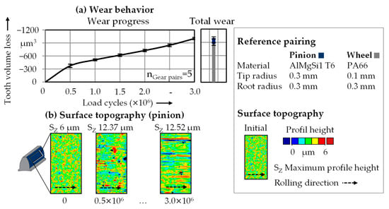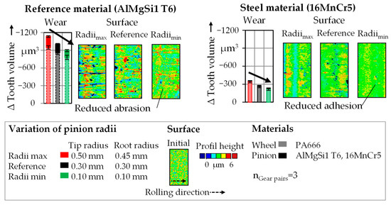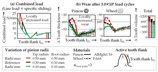 The resulting wear behavior of the different pairings is shown in Figure 10b. The highest wear occurs within the pairing with the maximum radii pinion, whereas the lowest wear occurs with the minimum radii. Compared to the reference, the resulting total wear volume after 50 h (3.0 × 106 cycles) rises from 1000.9 ± 47.6 µm3 to 1132.1 ± 53.4 µm3. In contrast, when using the pinion with minimum radii, the wear is only 894.2 ± 42.9 µm3. The evaluation of the decrease of the tooth thickness shows that the increase in wear occurs in the area of elevated combined load.