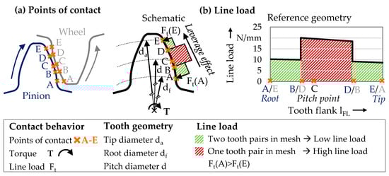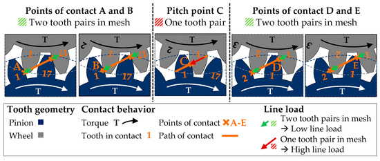 Figure 5 shows the points of contact resulting from the contact behavior and the acting line load along the tooth flank (Figure 4). When two tooth pairs are in mesh (contact points A to B and D to E), the line load is halved compared to areas with overlap of only one tooth pair (contact points B to D). The line load is reduced from a maximum amount of 20.6 N/mm (one tooth pair in mesh) to 10.3 N/mm (two tooth pairs in mesh). The load decreases in the direction of the tooth tip due to the leverage effect of the increasing diameter.