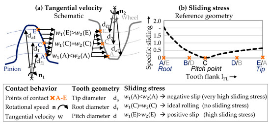 Figure 6a shows the tangential velocities along the tooth flank and the resulting sliding stress by means of the specific sliding. The tangential velocity increases along the tooth flank toward the tooth tip due to the increasing diameter.
