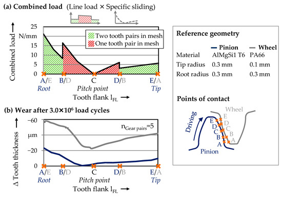A high load occurs in the root area of the tooth flank due to very high sliding velocities. Between contact points B and D, there is an increased line load because only one pair of teeth is in contact (contact ratio = 1), but the sliding velocity is very low, whereby ideal rolling occurs in the pitch point C. The combined load is much higher in the tooth root area than in the tooth tip area due to the high sliding speed. The evaluation of the decrease in tooth thickness along the tooth flank in Figure 7b shows that the wear occurring locally on the pinion and wheel correlates with the combined load.
