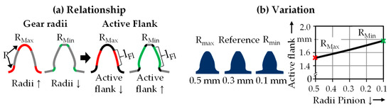 Based on the findings, functional relationships are derived (Figure 11). Changing the tooth geometry by reducing the tip and root radii of the pinion leads to an increased active flank of the pinion. This enlarges the overlap within the pairing.