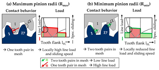 In contrast, minimum gear radii (Figure 9b) result in an enlarged overlap of two teeth and thus reduced line load. The influence of the gear radii on the contact ratio can be expected to be independent of elastic tooth deformation, since the available length of the active flank is changed.