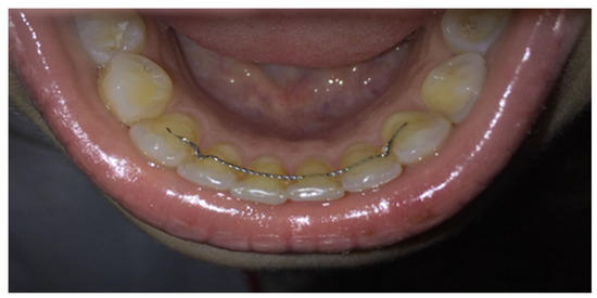 Fixed retainers (Figure 3) were introduced into clinical practice in the 1970s to prevent recurrences in the lower inter-canine zone are now commonly used [8,12]. Their advantages are aesthetics, effectiveness, the long-lasting, and the character of being fixed by which their behavior does not depend on the patient’s cooperation. The disadvantages are fragility, the vulnerable bonding technique, and the possibility of causing periodontal pathology due to a more difficult oral hygiene [8,12].