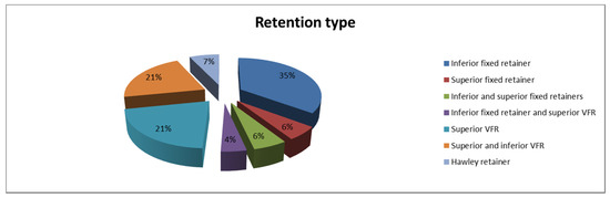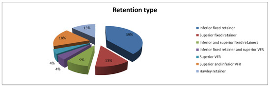 According to our analysis (Figure 4), male patients of the study group wore: inferior fixed retainer 39%, superior and inferior VFRs 18%, superior fixed retainer 13%, Hawley retainer 13%, inferior together with superior fixed retainers 9%, inferior fixed retainer together with superior VRF 4%, and only superior VFR 4%. Applying the SW test on data from Figure 4, the p-value = 0.06 was obtained; 0.06 > αsw indicated the passing of the normality assumption. The Grubbs test results indicate 39% as a statistically significantly higher value than the rest. Since the data passed the normality assumption, the mean was chosen as the central tendency indicator. The mean of the values is 14.29%, with a standard deviation (SD) = 12.02 and variance = 144.48.