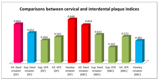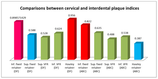 For the female group, the highest values of cervical plaque in ABC areas were determined in the case of lower fixed retainer wearers (0.822), and the lowest in the case of Hawley retainer wearers (0.387). The highest values of interdental plaque (DF) were demonstrated, similar with the male group by the Hawley retainer’s wearers (0.956) and the lowest by those with upper VFRs (0.488). Superior VFRs cause less cervical and interdental plaque accumulation in both male and female groups.