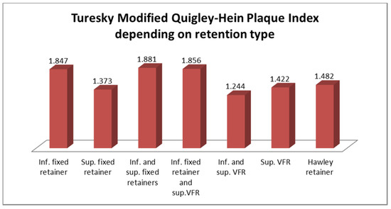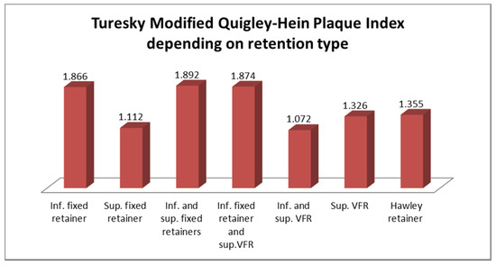 In the case of the Quigley–Hein plaque index modified by Turesky (TMQHPI) the highest value for the male group was demonstrated by patients wearing inferior and superior fixed retainers (1.881). TMQHPI values are also high when the lower retainer is used as a single element (1.847) or in combination with the upper VFR (1.856). However, TMQHPI values demonstrate the presence of good dental hygiene at the limit. The highest value of TMQHPI in female patients was also found in those with lower fixed retainers (1.866) and combinations of this with the upper retainer (1.892) and upper VFR (1.874). By analyzing the values of this index we can even support the positive effect of VFR in combating dental plaque formation because the lowest values of the averages (1.244 in the male group and 1.072 in the female group) were demonstrated by patients with both lower and upper VFRs.