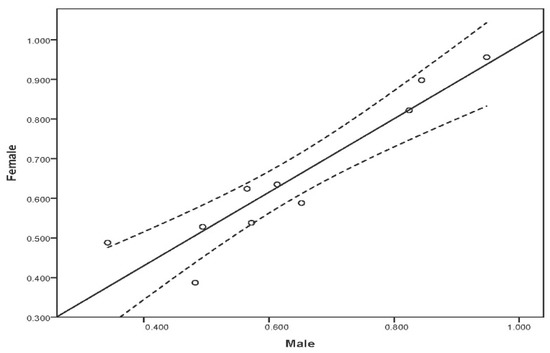 The existence of a linear correlation between Figure 5 and Figure 9 data of the RMNPI in male and female study groups was checked. Figure 12 presents the plotted regression line with the 95% confidence interval. Applying the Pearson correlation coefficient we get r = 0.93, with the 95% confidence interval, [0.74, 0.98]. Since r > 0 and 0.74 > 0, it can be concluded that exists a positive correlation; r indicates a very strong correlation (the visual interpretation of Figure 12 leads to the same conclusion). Table 1 illustrates the two indices’ values in the male and female groups.
