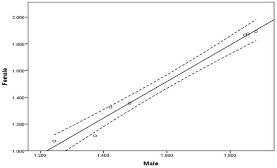 It was analyzed the existence of a linear correlation between Figure 6 and Figure 10 data of the TMQHPI in male and female study groups. Figure 13 presents the plotted regression line with the 95% confidence interval (dotted line). As a next step based on data normality it was decided for the calculus of the Pearson correlation coefficient, r = 0.99, with the 95% confidence interval, [0.94, 0.998]. As r > 0 and 0.94 > 0 it can be concluded that exists a positive correlation. r ∈ [0.9,1] indicates the existence of a very strong correlation (the visual interpretation of Figure 13 lead to the same conclusion).