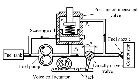 In the FADEC (full authority digital electronic control) system, the flow area of directly driven valve (DDV), i.e., metering valve, is proportional to the linear displacement of voice coil actuator (VCA), and the pressure compensated valve can maintain the pressure-difference across DDV constant [33,34]. Thus, fuel flowrate of FCS can be regulated by the DDV. The flowrate control system with DDV driven by VCA is shown in Figure 4. The problem of poor reliability caused by oil contamination in servo valve can be solved by employing the FCS with DDV. However, due to the fluctuation in scavenge oil flowrate, the spool displacement of pressure compensated valve will be changed frequently, which results in the fluctuation of discharge fuel flowrate.