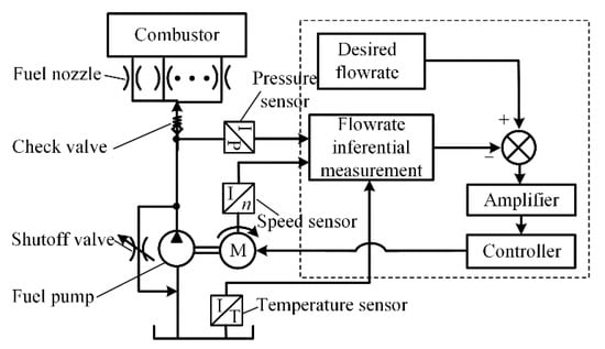Figure 6 shows a schematic of one kind of MEE-FMS with metering valve, where the fuel flowrate is regulated by the opening and differential pressure of FMV, and the FADEC can collect Δp from the pressure-difference sensor and control Δp to track the desired pressure-difference by regulating the speed of the motor. The fuel flow feedback can compensate the performance degradation of fuel pump by increasing the pump speed.