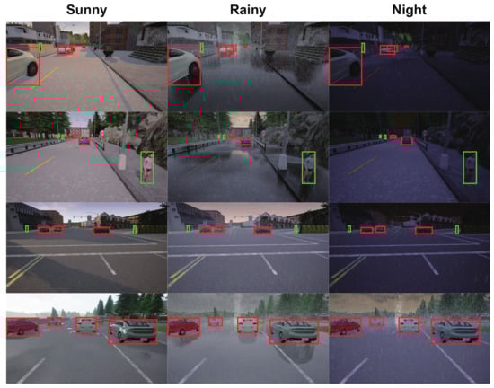 Selected images synthesized by CarFree with automatically generated 2D object detection ground truths (GTs), represented by the red and green bounding boxes for vehicles and pedestrians, respectively. The three columns represent different weather and lighting conditions for the four driving scenes by the rows.