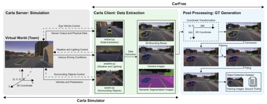 Figure 2 shows the overall design of CarFree that comprises the following parts: (i) the Carla server in the left, (ii) the data extraction part in the middle, and (iii) the GT generation part in the right.