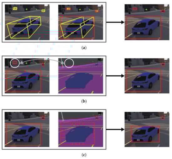 In the leftmost part of Figure 3c, notice the considerable gap between the initially proposed bounding box and the boundary of the actual vehicle. To make it more precise, we need to fit the bounding box to the exact area occupying the object. For that, the semantic segmentation image is once again utilized. The middle part of Figure 3c illustrates the fitting process. It begins with the initial bounding box, and the four sides of it gradually moves toward their opposite directions until all of them meet at least one pixel that belongs to the target object. After that, the resulting bounding box becomes tightly fitted to the object, as shown in the rightmost part of Figure 3c.