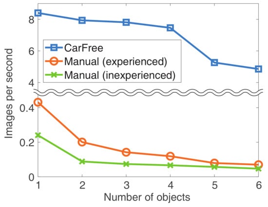 Scalability. Figure 5 compares the average performance (i.e., images per second) of the GT generation process of CarFree with experienced and inexperienced human workers. Their performances are evaluated with six different image sets with 150 images each. The images are grouped by the number of objects in each image, from one object to six objects. For the experiment, we employed a volunteer who had no experience with any GT labeling tool. We also employed another volunteer who previously had done lots of GT labeling jobs. The figure shows that CarFree can generate a much larger number of images than human workers do. For example, for the one object case, CarFree’s throughput is 1948% compared with the experienced worker and 3491% compared with the inexperienced worker. With more objects in each image, the performance gap generally gets larger. The figure also shows that the number of objects in each image significantly affects the labeling performance of the human labor, whereas the effect is less significant in CarFree. More specifically, by comparing the case of six objects with the case of one object, CarFree’s performance dropped from 8.40 (100%) to 4.85 (58%), whereas the experienced worker’s performance dropped from 0.43 (100%) to 0.07 (16%), and the inexperienced work’s performance dropped from 0.24 (100%) to 0.047 (20%).