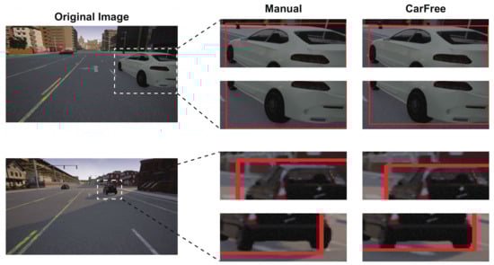 Precision. Throughout the generated training images, we visually examined their precision by human eyes and confirmed that every relevant object is successfully located by our GT generation process. Further, as exemplified by Figure 6, our generated bounding boxes are with pixel-level precision, whereas manual labeling cannot produce such precise bounding boxes. Moreover, note that tiny distant objects are easily ignored by human eyes, whereas CarFree does not miss even such tiny objects.
