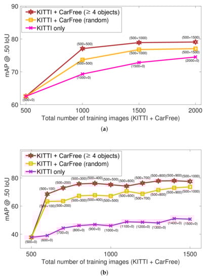 Figure 7a compares the object detection accuracy, i.e., mAP (mean average precision), of the above three training strategies with varying number of training images. The x-axis begins with 500, indicating the number of baseline images. The mAP is measured by the evaluation set with 200 random BDD100K images. As shown in the figure, as we add more and more training images, the performance generally gets better. Moreover, it shows that KITTI + CarFree (random) outperforms KITTI only, and KITTI + CarFree (≥4 objects) performs even better. More specifically, with 2000 training images, KITTI only’s mAP is 74.51, whereas KITTI + CarFree (random) reaches 77.06 and KITTI + CarFree (≥4 objects) reaches 79.08. The results indicate that the diversity, which is often missing in many real-world datasets, of our synthesized images significantly reinforce the training process.