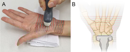 - Lee, J.C.; Healy, J.C. Normal sonographic anatomy of the wrist and hand. Radiographics 2005, 25, 1577–1590. [Google Scholar] [CrossRef] [PubMed]