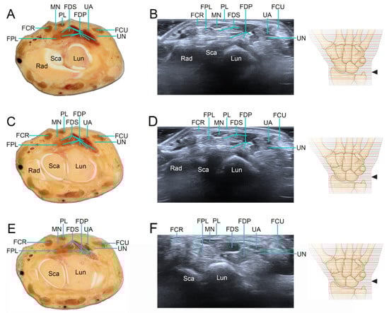 Sectioned images (A,C,E) and the corresponding US (B,D,F) images for transverse views at the radiocarpal joint. (A,B) The Rad contacts the scaphoid (Sca) and lunate (Lun) at the radiocarpal joint. The MN slightly moved along the second FDS tendon (A), and the MN is on the second and third FDS tendons (B). The UA is just radial to the FCU tendon, and the UN is deep to the FCU tendon. (C,D) At a more-distal level, the Sca and Lun become larger than at their former proximal level. The anterior border of the Lun becomes sharp and triangular in shape. The UA and UN gradually move toward the radial side, the UA is just radial to the FCU tendon, and the UN is deep to the FCU tendon. (E,F) At an even more-distal level, the anterior border of the Lun has a smooth convex shape. The amount of muscle fibers in the FDS and FDP decreased. The PL, FCR, and FCU tendons have constant sites and sizes. The UA is just radial to the FCU tendon, and the UN is deep to the radial side of the FCU tendon. Arrowheads in the schematics indicate the levels of the wrist scanned by the US transducer.