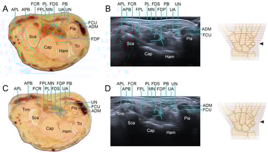 Sectioned images (A,C) and corresponding US (B,D) images for transverse views at the distal part of the proximal carpal bones. (A,B) The Sca becomes smaller and the Cap becomes larger. The PL tendon becomes flat and is between the abductor pollicis brevis (APB) and palmaris brevis (PB). The FCR tendon is deep to the APB. The ADM becomes thicker and is on the ulnar side of the Pis and FCU tendon. In the thenar eminence, the APB muscle and abductor pollicis longus (APL) tendon are observed. The FPL tendon is oval in shape and is just radial to the FDS and FDP tendons. The MN is on the second and third FDS tendons and is deep to the PL tendon. The UN and UA are just radial to the Pis, and are anterior to the fourth and fifth FDS tendons and deep to the PB. (C,D) At a more-distal level, the Pis and trapezium (Trm) become smaller. The Trm appears to articulate with the Sca. The ADM becomes thicker, and the FCR tendon is just on the ulnar side of the Trm. The MN is on the second and third FDS tendons deep to the PL tendon. The UN and UA are radial to the Pis, on the fourth and fifth FDS tendons, and deep to the PB. Arrowheads in the schematics indicate the levels of the wrist scanned by the US transducer.