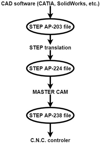 STEP is a standard that gives the obvious and complete representation of the par data during the life cycle, independent of any system [28]. In a STEP file, the specification of product information is standardized by ISO10303, and there are many application protocols (APs) available in it which are used for different applications, such as AP203, AP214, AP224, AP238, etc., as illustrated in Figure 2. The process begins with exporting the model from the STEP AP-203 file. The file is translated for producing an AP-224 data file which is read by MASTERCAM (CNC Software Inc. founded in Massachusetts, USA, 1983). Then, MASTERCAM generates an AP-238 file which contains the geometrical information, features, and tool path for the controller of the machine.