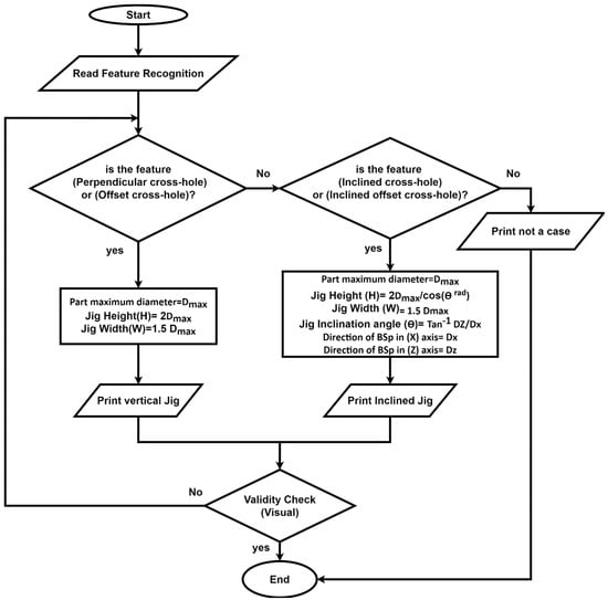 The flowchart shows that the jig design process depends on the cross-hole feature. Initially, the system read the feature recognition to identify the cross-hole type. If the cross-hole is perpendicular or offset, the system will design a vertical jig according to the design rules. If the cross-hole is inclined or inclined offset, the system will design an inclined jig according to the design rules.
