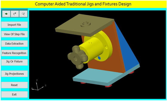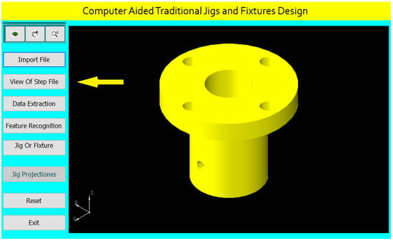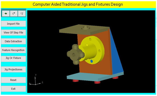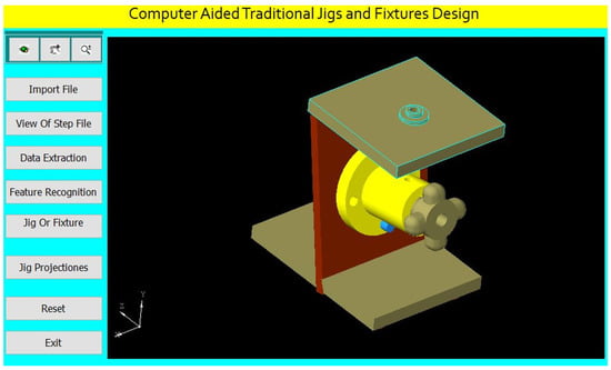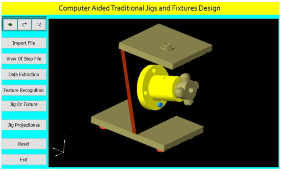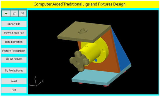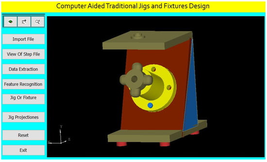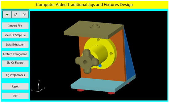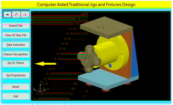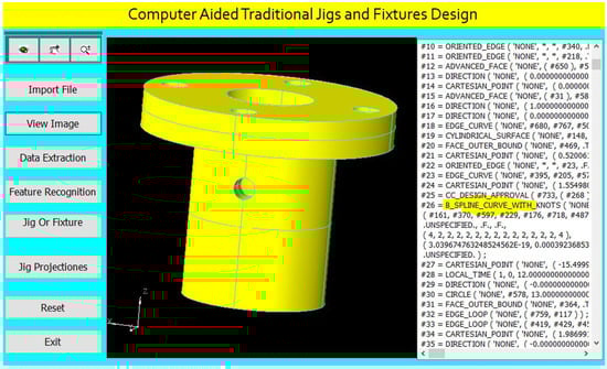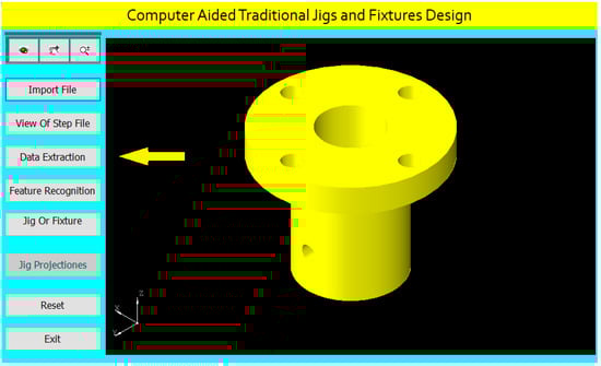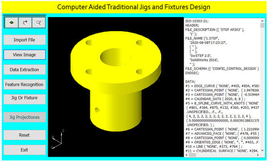 Clicking the (Start) button opens the system interface which contains a group of buttons for importing the STEP AP-203; file, extracting the geometrical data from the STEP AP-203 file, feature recognition, and designing the traditional jigs and fixtures.