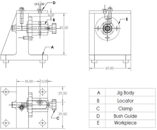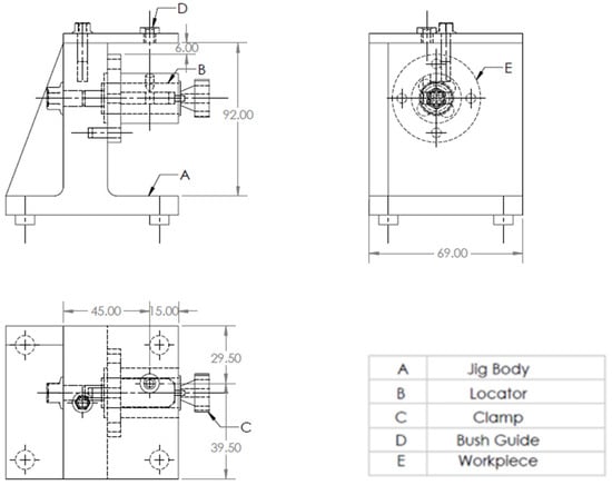 The jigs and fixtures design process have four phases, which are typically setup planning, jig and fixture planning, unit design, and verification. In the setup planning phase, analyzing the workpiece and machining information is done for determining the suitable position of the locating units and all the setups needed to perform the required machining operations. In the jig and fixture planning phase, six fixturing requirements (physical, tolerance, constraining, affordability, collision prevention, usability) are generated for the setup of a specific manufacturing operation as well as the fixture’s layout plan which details the workpiece surface with the positioning of the locating and clamping units. In the unit phase design, the appropriate design generation of units is conducted, such as the design of locating and clamping units for obtaining an accurate location and to overcome the deformation of the fixture components. In the verification phase, the jig and fixture test is carried out. This phase can also be performed before the unit design phase for evaluating the validity of the current fixture system layout [23,24].