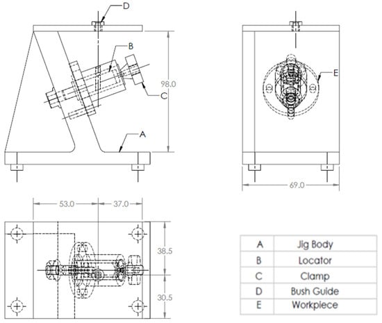 Figure 49 shows the drawing of the cylindrical part with an inclined cross through-hole, and Figure 50 shows the main components of the required jig design which will be done through the following steps: