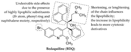 Chemical structure of bedaquiline (BDQ) and its structural modifications that lead to more cytotoxic derivatives or to molecules showing undesirable side effects.
