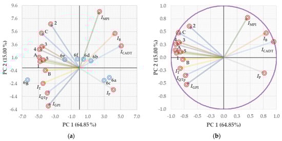 The XLSTAT software, version 2016.02.28451 (Addinsoft, New York, NY, USA) was employed for PCA [49] to explore properly the relationships between values of estimated analytical and physicochemical descriptors (m/zmeasured, log ε2 (Ch–T), and log kw) as well as log (1/MIC (M)) and log (1/IC50 (M)) parameters derived from both the MIC and IC50 data sets. These parameters resulted from in vitro biological (antimycobacterial and cytotoxic) evaluation of 6a–g (Table 3). In addition, the in silico descriptors (IGPI, IMPI, ICADT, IB, IP, IT and IQTp; Table S3) of corresponding bases (5a–g) were also involved in these analyses.