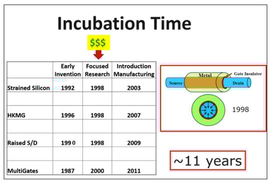 Therefore, a new era, the “equivalent scaling”, based on strained silicon [8,9], high-κ/metal gate [10], raised Source/Drain [11], multigate [12] specially FinFET [13] or Gate-All-Around (GAA) [14], was launched at the end of the 1990s. This novel strategy allows to reduce the historical time of ~25 years for the development of major transistor innovations to less than half in and to save the semiconductor industry, which introduces these innovations by 2011 into high volume manufacturing (Figure 2 and Figure 3).