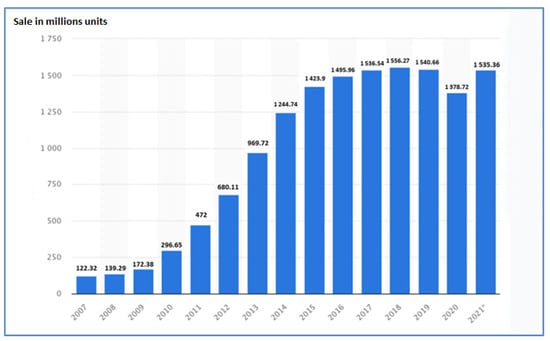 On the other hand, a huge growth was observed from 122 million in 2007 to 1.5 billion smartphones in 2017, with some saturation and a decline for the first time in 2020 (Figure 7).