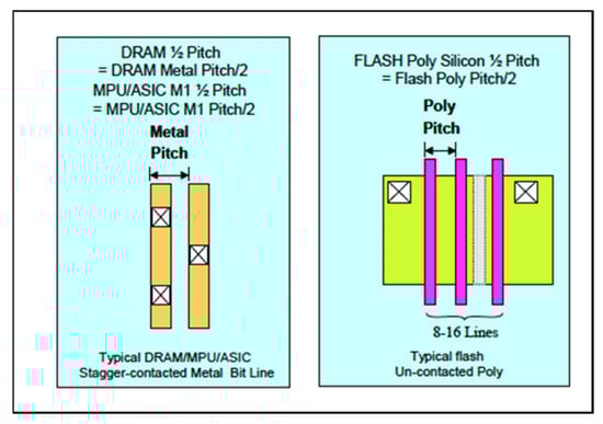Technology nodes were previously defined from 1992 by NTRS, ITRS and IRDS by the densest metal layer to be found in any integrated circuit leading to the smallest pitch. Half pitch of the tightest metal layer was the original definition of the node (Figure 8), which was correlated to the gate length of the devices till the 1990s, leading to both density and performance with a single number. A new technology generation used dimensions of 70% of the previous one.