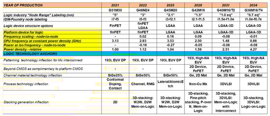 IRDS Roadmap for the next years. Notes: Mx—Tight-pitch routing metal interconnect, IDM—integrated device manufacturer, FinFET—fin field-effect transistor, LGAA—lateral gate all around, EUV—extreme ultraviolet, NA—numerical aperture, Ge—germanium, SiGe—silicon germanium. RMG—replacement metal gate, VLSI—very large-scale integration, W2W—wafer to wafer, D2W—die to wafer, Mem-on-Logic—memory on logic.