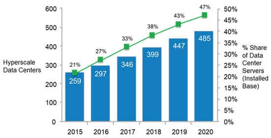 The number of data centers is accelerating (source: Cisco Global Cloud Index, 2015–2020, Synergy Research).