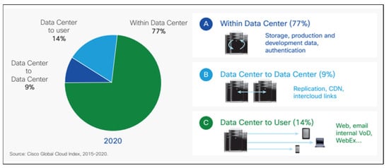 Traffic within data center is the bottleneck (source: Cisco Global Cloud Index, 2015–2020).